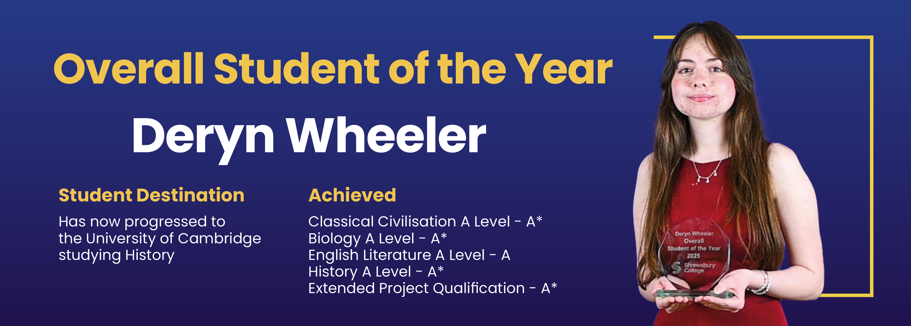 The Overall Student of the Year award was presented to Deryn Wheeler in recognition of her outstanding academic achievements and her thoughtful, dedicated approach to learning.